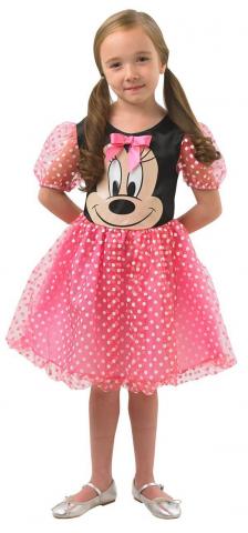 This Kids Minnie Mouse Puffball Dress includes a pink, white and black dress with tinted pink puff sleeves and a white polka dot puffed skirt with an image of Minnie's face on the front.