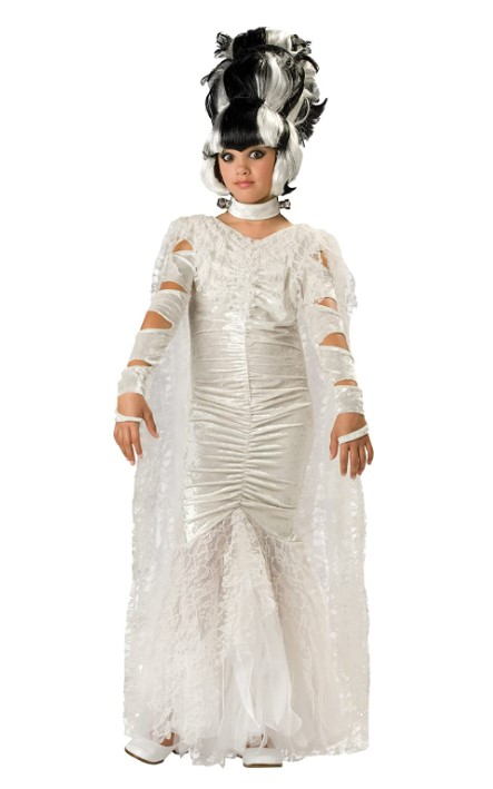 This Monster Bride Child Costume includes a full length gown with lace and organza details and detachable dramatic shoulder drapes, character beehive wig and choker with vinyl bolts.