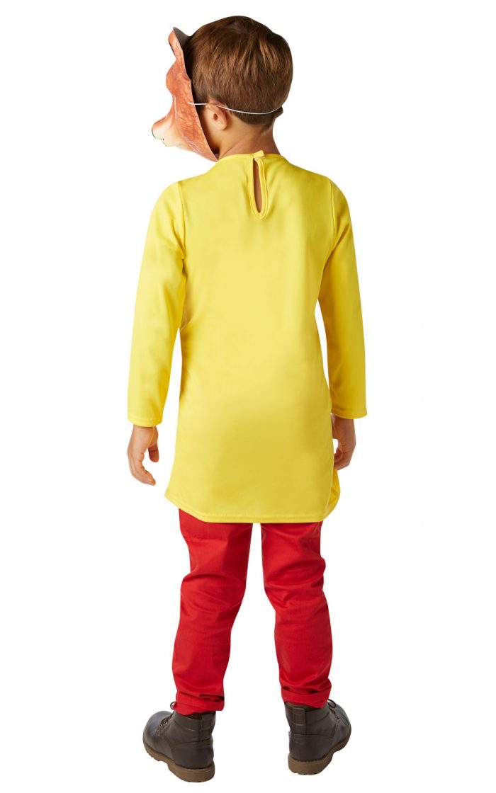 This Kids Mr Bear costume includes a long yellow jacket with a waistcoat and attached faux fur chest. Also included is a neck scarf.