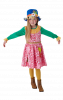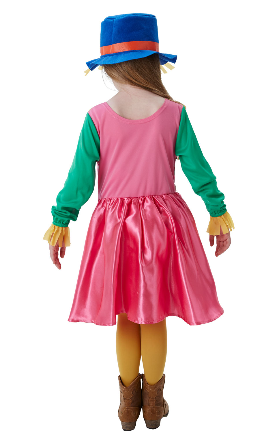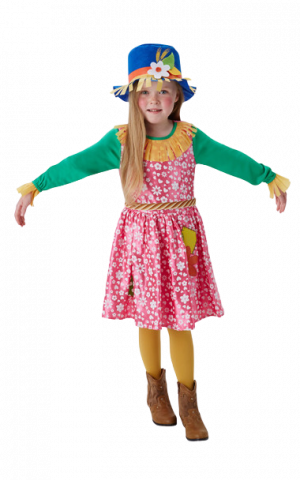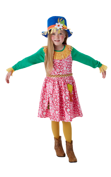 This Kids Mrs Scarecrow costume includes a long sleeved dress with printed skirt and a neckerchief. To complete the look a hat is also included.