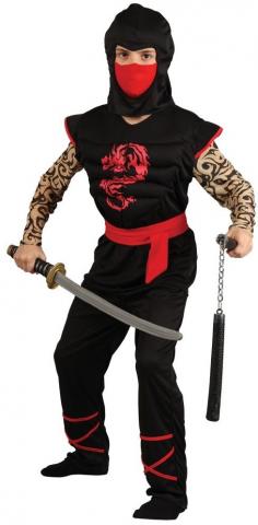 This Kids Muscle Chest Ninja Warrior Costume includes a black and red top with muscle chest and tattoo sleeves. The costume also includes a pair of black trousers with red leg straps.