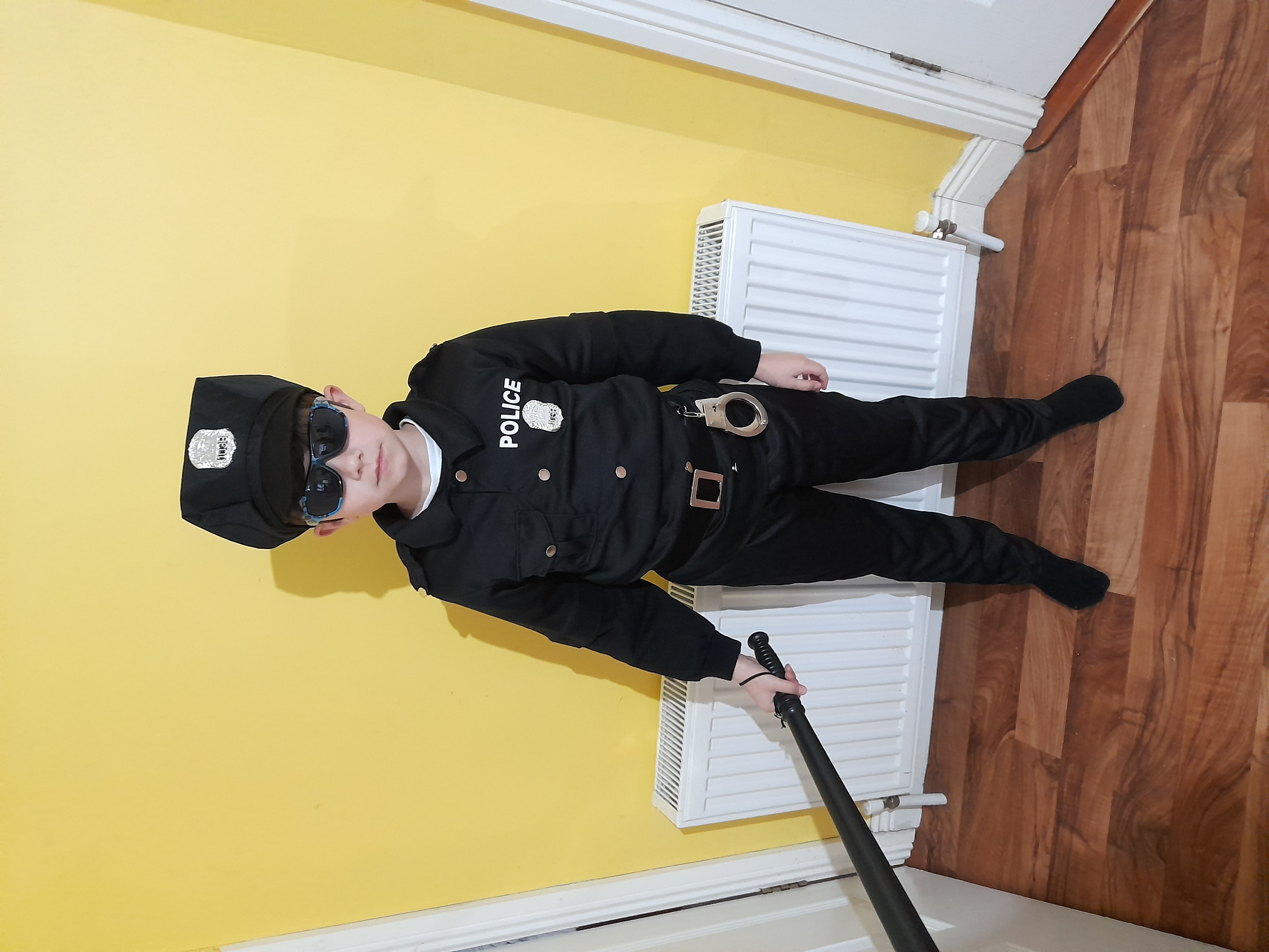 This Kids New York Cop costume includes a black Police shirt with button and badge detailing. The costume also includes a pair of black trousers and a belt.