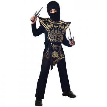 This Kids Ninja Assassin Costume includes a black jumpsuit with a gold printed tabard.