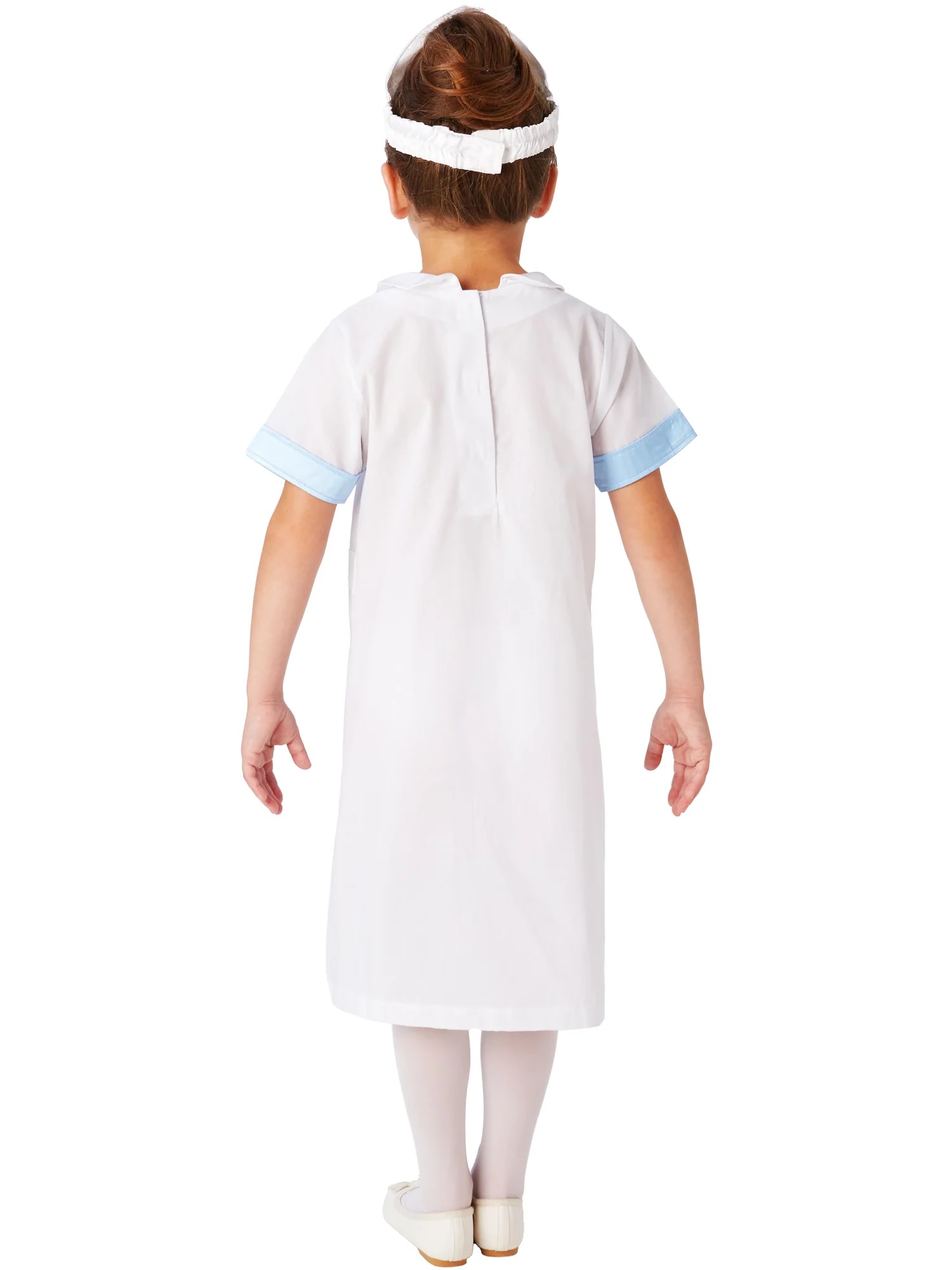 Nurse Costume includes blue and white dress with stitched on fabric watch and apron with cross detail, white hat with cross detail on the front and white bag with blue handle.