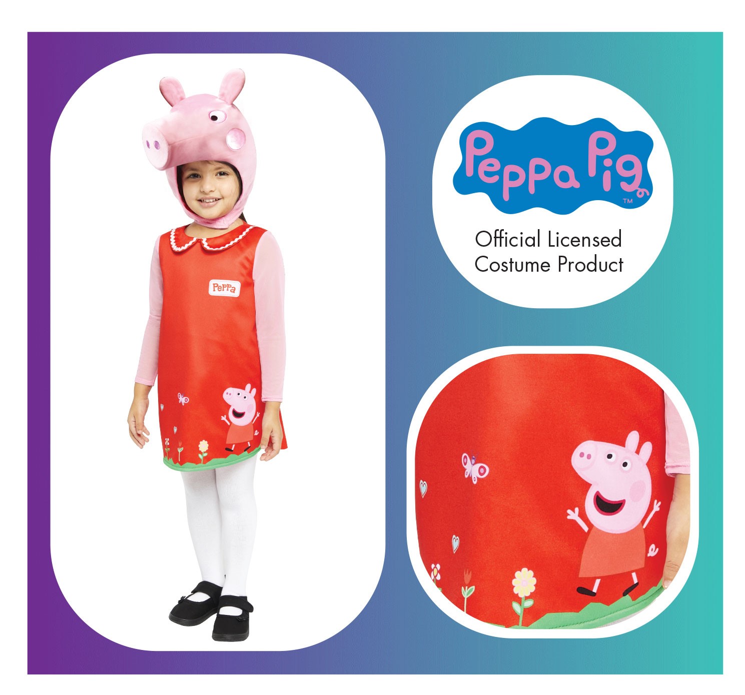 This kids Peppa Pig Plush Head Costume includes a printed dress. To complete the look a plush head piece is also included.