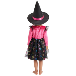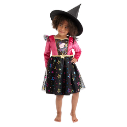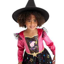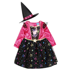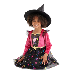 Oink oink! Delight with our Peppa Pig star print Witch Kids Costume -features a beautiful black and pink dress with glittery star designs throughout to help any witch stick out from the crowd. To complete the look, it includes a pointy black witch style hat and plenty of twirly tulle layers for a fun and not-so-scary take on Halloween.