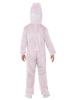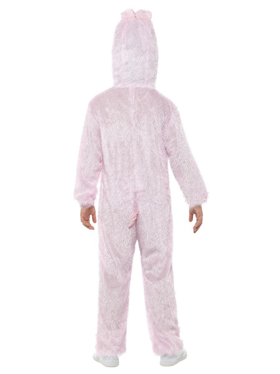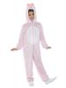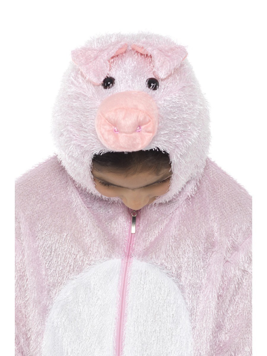The Pig Costume includes a textured pink zip-up jumpsuit with white stomach and an attached hood with pig eyes, ears and snout.