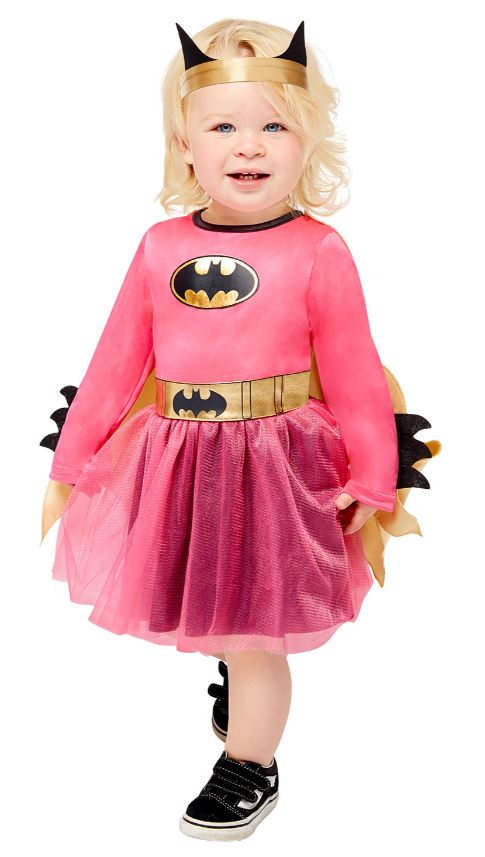 This costume includes a pink dress with an attatched cape. To complete the look a batgirl headband is also included.