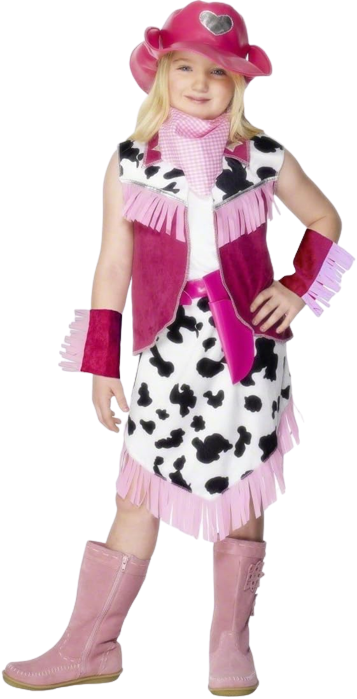 This Pink Rodeo Girl Costume includes a cow skin patterned skirt, matching waistcoat with pink bottom, pink cuffs with fringing and pink gun holster.