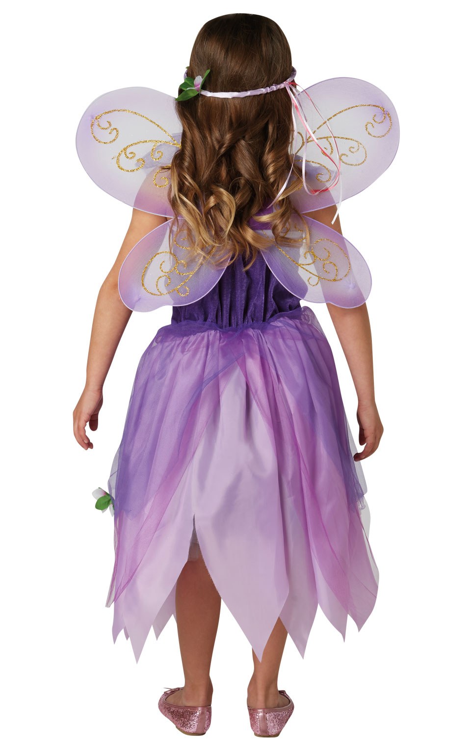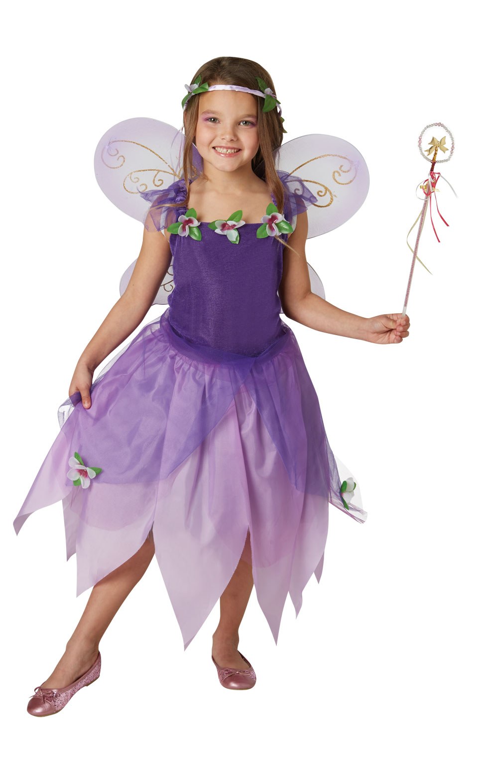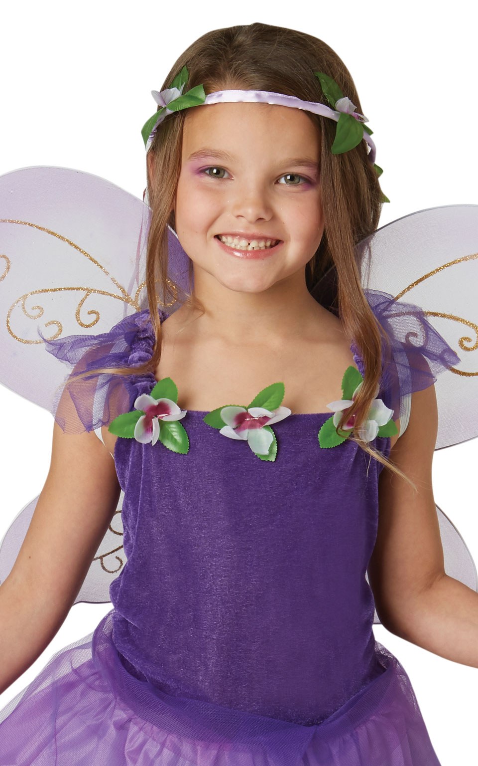 The childrens Plum Pixie costume includes purple dress with attached flowers, wings with gold detail, flower headpiece & wand.
