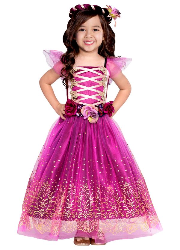 This dress is perfect for any little princess! This costume features a mixture of pink and plum shades, detailed embroidery, laced bodice with gold ribbons and net puff sleeves. The top is covered with pink net and golden sparkles to make this costume really stand out from the crowd! To complete the look, a satin skirt is included which flows from the waist including a hooped hem attached to hold it in place.