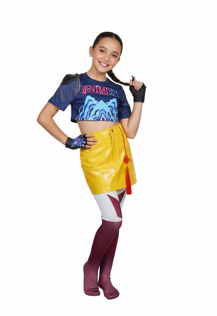 Channel the spirit of a pop star demon hunter in the dynamic Mira Complete Set. Complete with a fashionable shirt, striking epaulet, sleek gloves, and a captivating skirt with chains, this outfit is perfect for young adventurers.