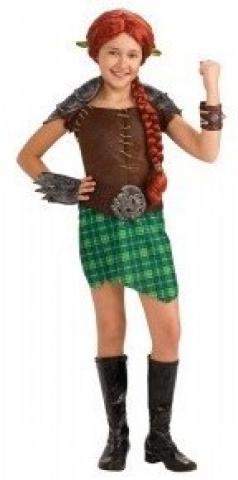 Stand out from the crowd in this deluxe Princess Fiona warrior costume! This Kids Shrek Forever After Princess Fiona Warrior Costume includes a dress with attached latex shoulder guards. Costume also includes a belt, cuff and a gauntlet. To complete the look a Princess Fiona headpiece is also included.