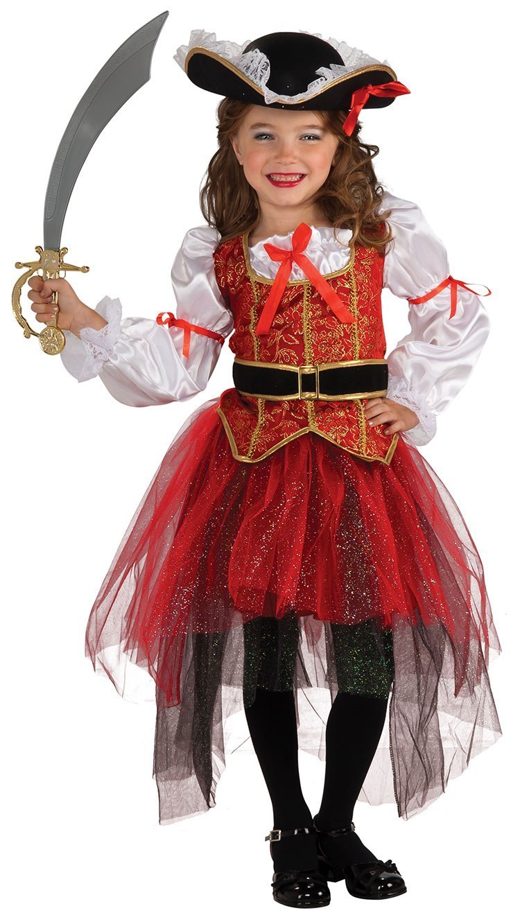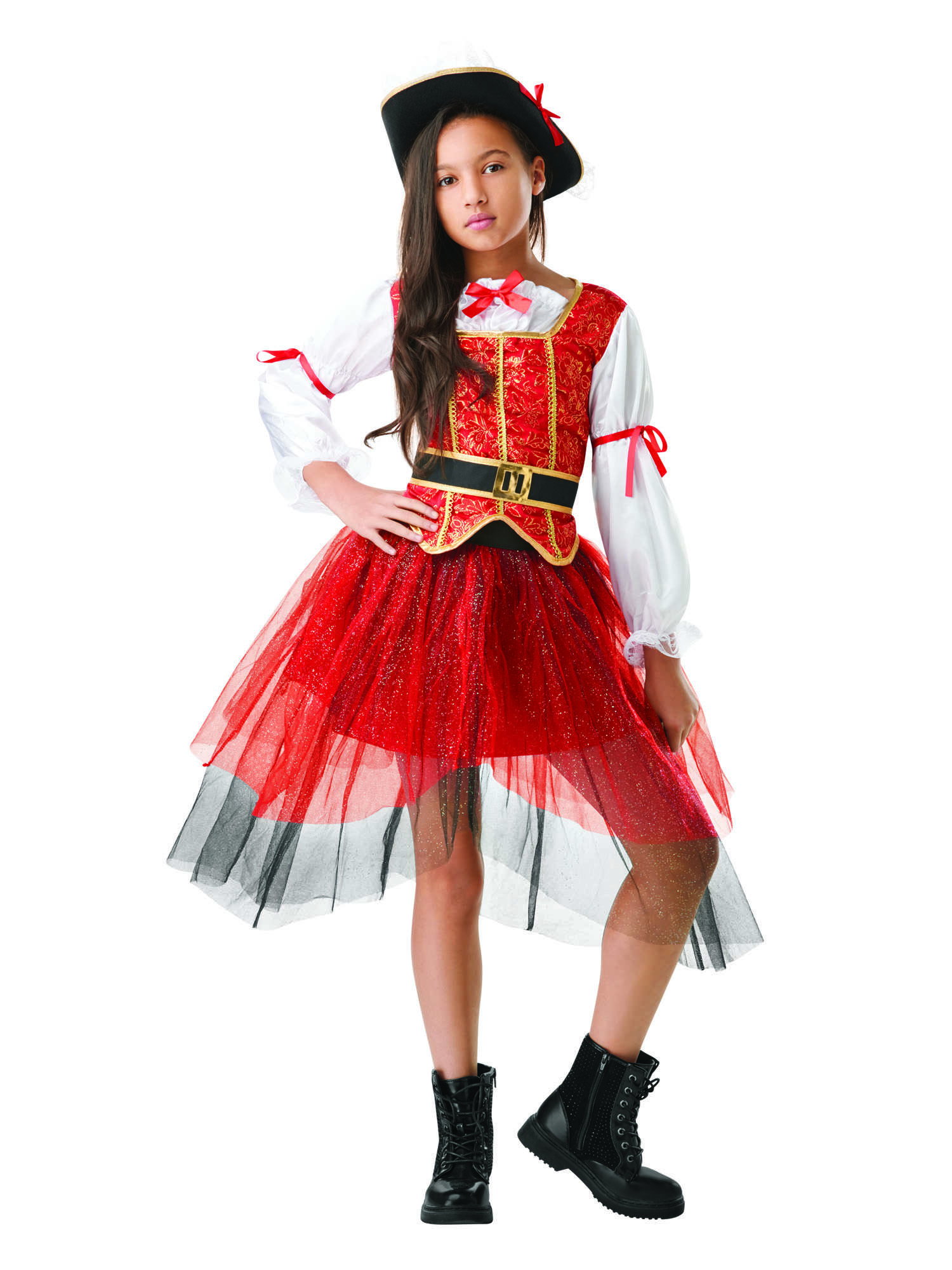 Arrrr Princess! Travel The Seven Seas On An Adventure With This Girls Princess Of The Seas Pirate Costume. It Features A White Elegant Shirt With Attached Red Vest And Gold Trim. Also Includes A Beautiful Red And Black Tulle Skirt With A Black And Gold Polyfoam Belt with faux buckle. The pirate hat is also included with bow and gold trim. She’ll be next in line to take over the pirate Captain’s throne with this costume!