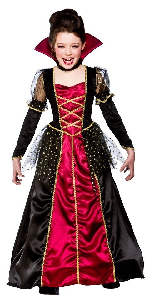 Kids Princess Vampira costume includes a deluxe dress with mesh and sequin detail and a hooped petticoat. Costume also includes a stand up collar.
