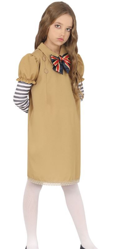 Kids psycho doll costume, inspired by M3GAN movie, creepy doll look, tan dress with striped sleeves, red bow detail, soft and comfy fabric, easy to wear, perfect for Halloween, horror cosplay, dress-up parties, spooky style, doll-like appearance
