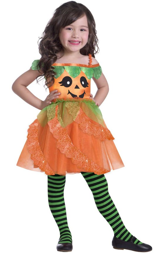 Your little one is sure to stand out from the crowd this Halloween Trick or Treating with this adorable Pumpkin Sweety Costume. It features a bright orange and green detailed dress with a pumpkin face detailed on the front and sparkly detail around the skirt. This is the perfect costume for any pumpkin themed fancy dress party!