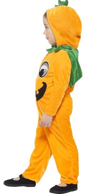 Pumpkin Toddler Costume includes an orange and black hooded jumpsuit with 3D printed eyes.