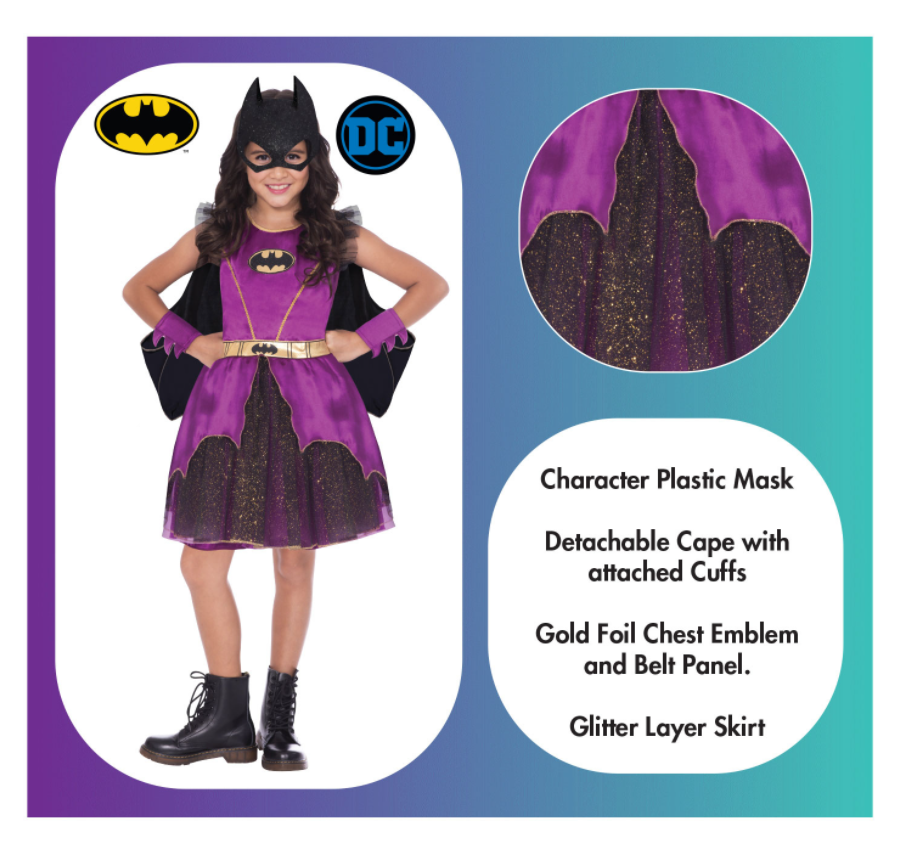 DC Comics licensed kids Purple Batgirl costume. Transform your little one into there favourite superhero.