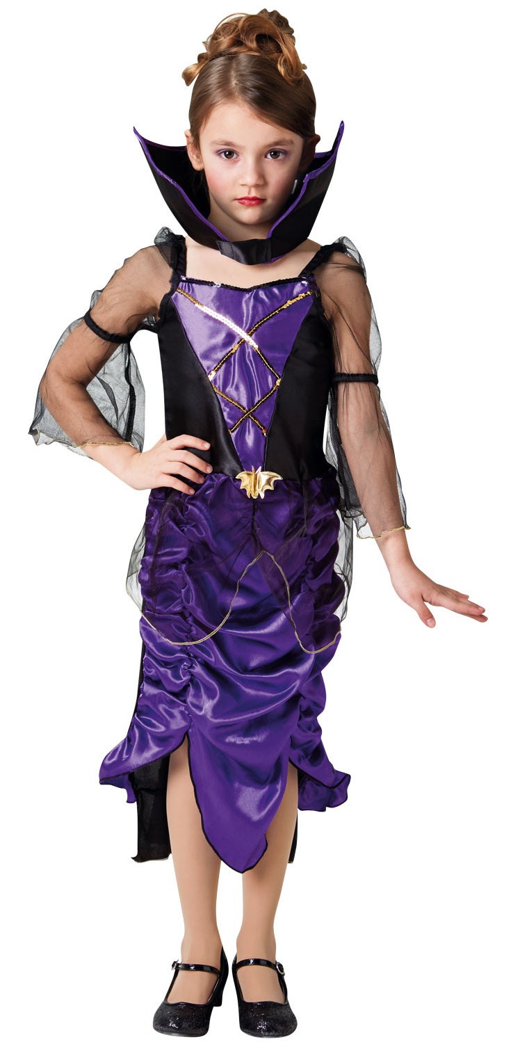 This Purple Gothic Vampiress Kids Costume is gothic style black and purple, faux satin dress with flared mesh sleeves and a gold bat brooch.