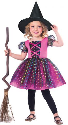 Show up to any Halloween party or event with this adorable Rainbow Witch Children's Costume. This features a beautiful bright pink dress that includes a tulle layered skirt and tulle short sleeves with multicoloured stars decorated all over. To complete the look, it also includes a traditional black pointy witches hat.