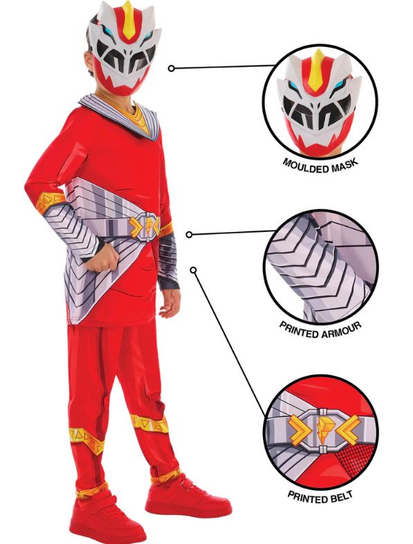 The outfit includes a top and trousers with vibrant character graphics that bring the Red Ranger’s suit to life, plus a mask for an authentic finishing touch. Perfect for Halloween, costume parties, themed events, or everyday role play, this costume will make any child feel like a true Power Ranger leader!