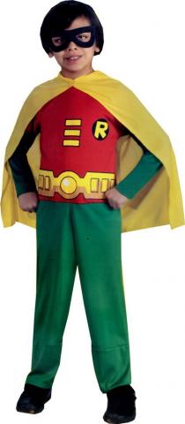 This Kids Robin Fancy Dress in red, yellow and green comes complete with jumpsuit, Cape and black eye mask.