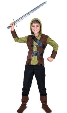This Robin Hood Kids Costume includes a green and brown hooded top with an attached waistcoat. The costume also features a shoulder strap and a belt.