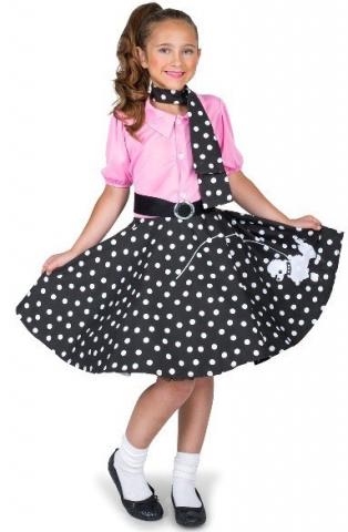 This Kids Rock 'n' Roller Girl Costume includes a dress with a top top and a black and white polka dot skirt with poodle print. The costume also includes a belt.