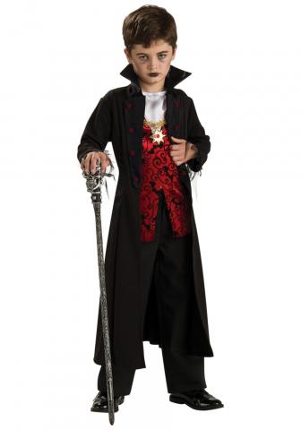 Become a true Royal Vampire with this costume. It includes an all-in-one costume with red velvet waistcoat, attached full-length black cape and white undershirt.