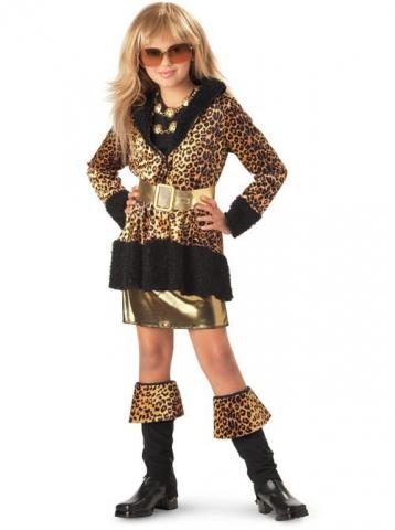 The Runway Diva Costume has a leopard skin patterned jacket and a Persian lamb type trim, gold elasticated mini skirt, gold belt and black boot covers with leopard print trim.