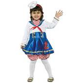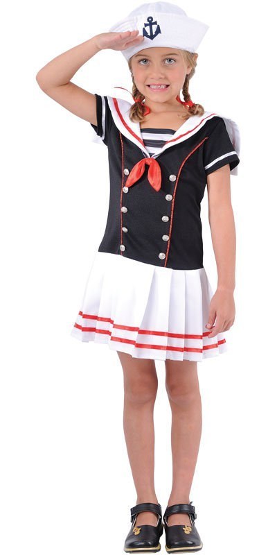 Ahoy Sailor ! Raise anchor and set sail with this beautiful Kids Sailor Girl Costume! This costume features a classic navy and white short sleeved dress. The top is navy in colour with silver button detailing and a red trim. The skirt is white and pleated with two red stripes. To finish the look, it includes a cute white sailor hat with printed anchor.