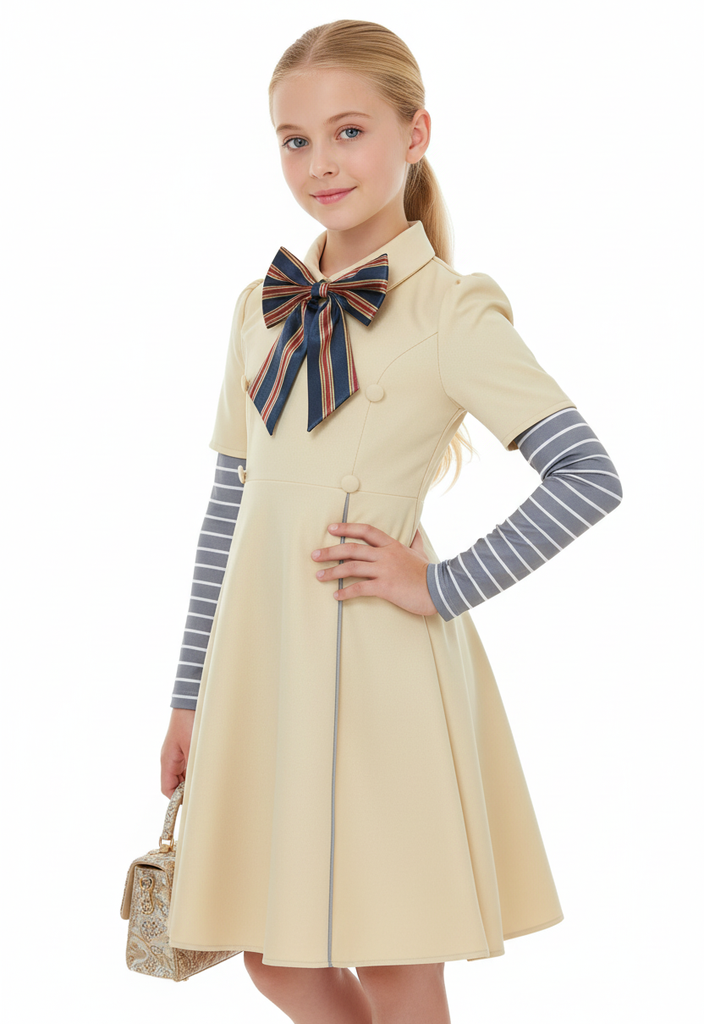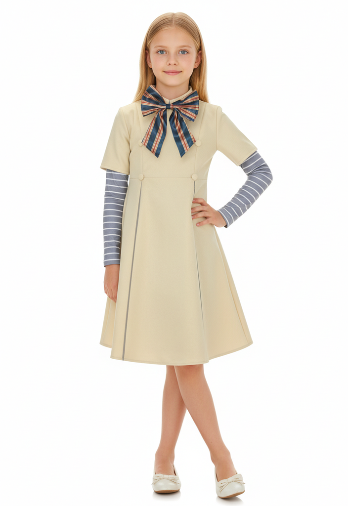 This Scary Doll Character Costume for Kids includes a beige dress, white tights, a striped bow tie and grey pattern detached sleeves.