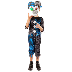 Your little terror will love getting in the Halloween spirit with this spooktacular scary jester costume. Our set includes a fabulously wicked mask complete and a coordinating top and bottoms with one touch fastenings for fancy dress made easy. Trick or treat anyone?