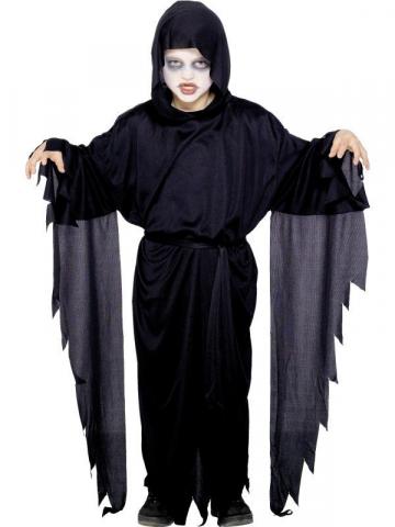 This Kids Ghost Screamer costume includes long black hooded robe and a black belt.