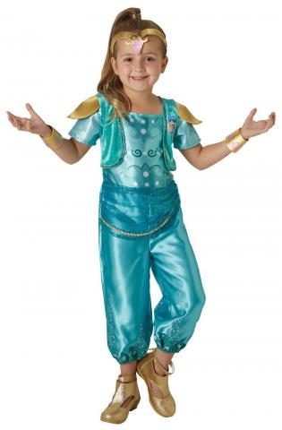 This Shimmer & Shine Shine costume includes a one piece harem style jumpsuit with an attached waistcoat with gold detail.