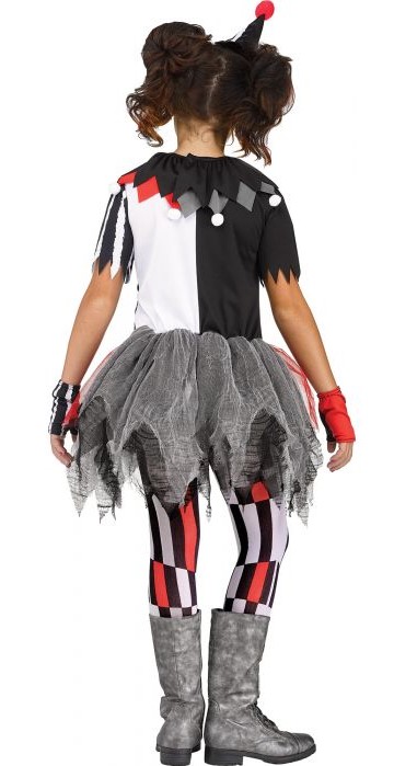 This Kids Sinister Circus Clown Costume includes a dress with a collar. To complete the look finger less mits, footless tights and a hat headband are also included.