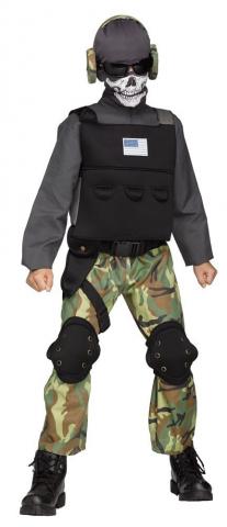 This Kids Skull Soldier Costume includes a one piece Jumpsuit and a skull print balaclava. Also included is a vest, belt and a pair of thigh holster knee pads.