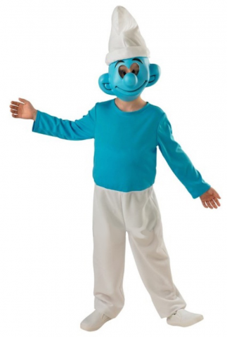 This Kids Smurf Costume includes a blue and white one piece jumpsuit and white hat.