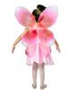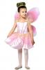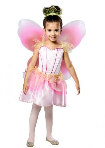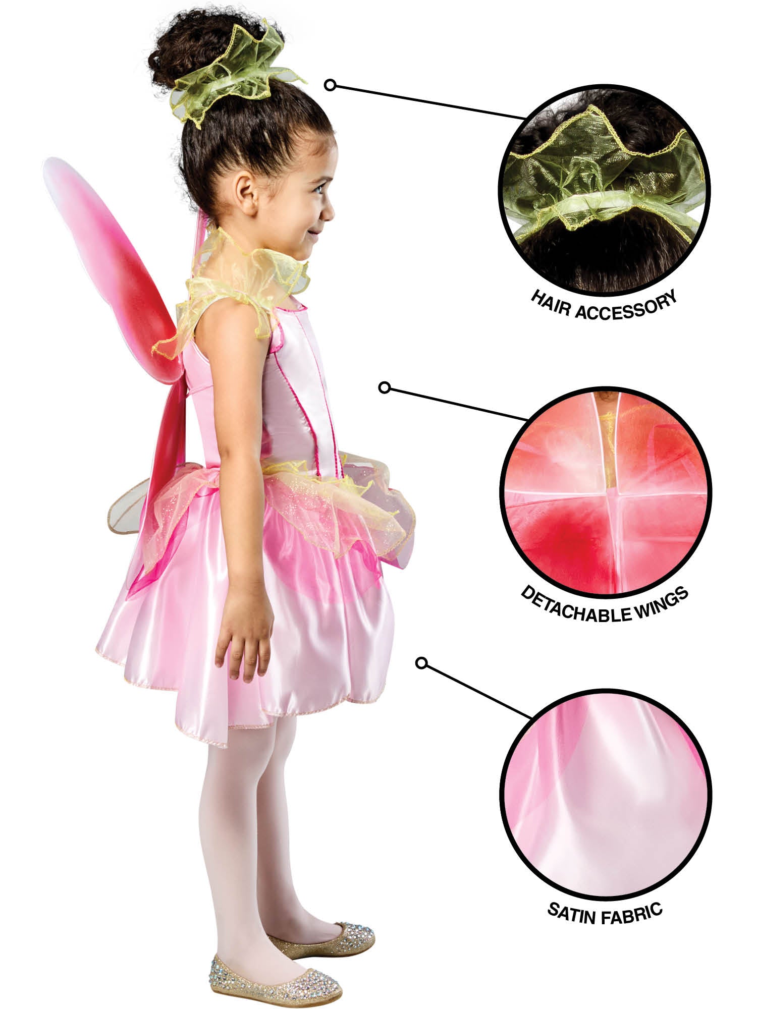 This adorable Springtime Fairy Costume includes a pink satin dress with green tulle accents at the shoulders and waist and dark pink petal overskirt.