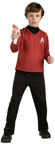 This Kids Star Trek Scotty costume includes a red top with embroidered emblem and a pair of black trousers with boot tops.