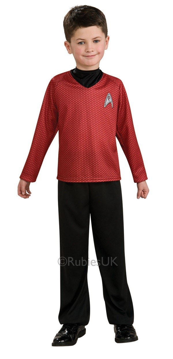 This Kids Star Trek Scotty costume includes a red top with embroidered emblem and a pair of the black trousers.