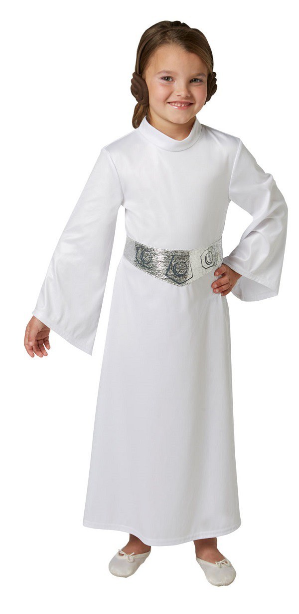 This Kids Princess Leia costume includes a long white dress with an attached silver belt. To complete the look a headband is also included.