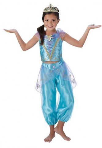 This Kids Storyteller Disney Jasmine costume includes a satin blue top with a character cameo and a pair of trousers with sparkly glitter detail.