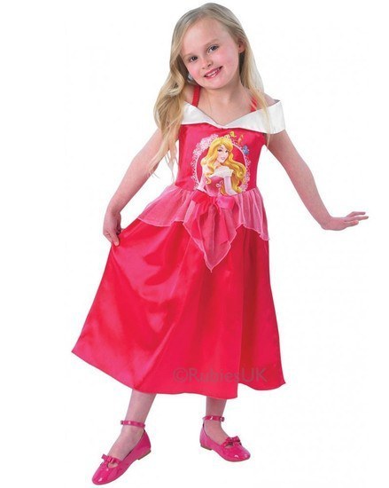 Transform into Disney's Sleeping Beauty character in this pretty pink faux satin dress with white off the shoulder cap sleeves, bow detail and princess Aurora print on the chest.