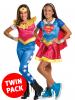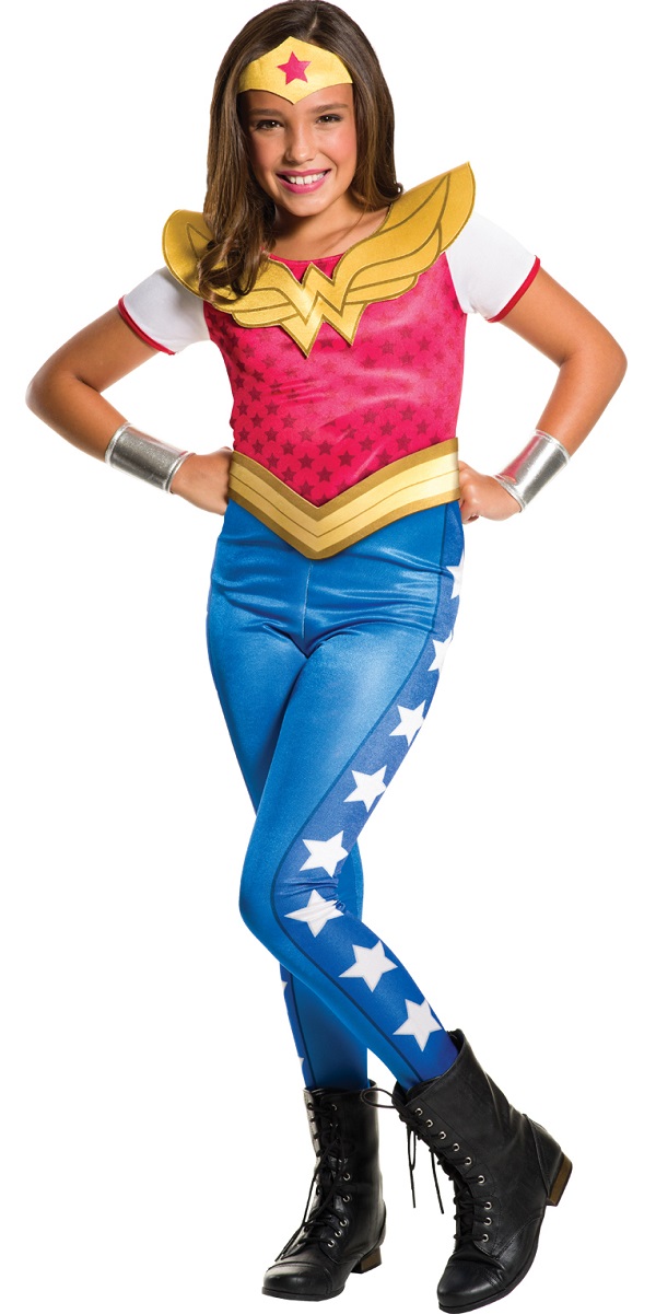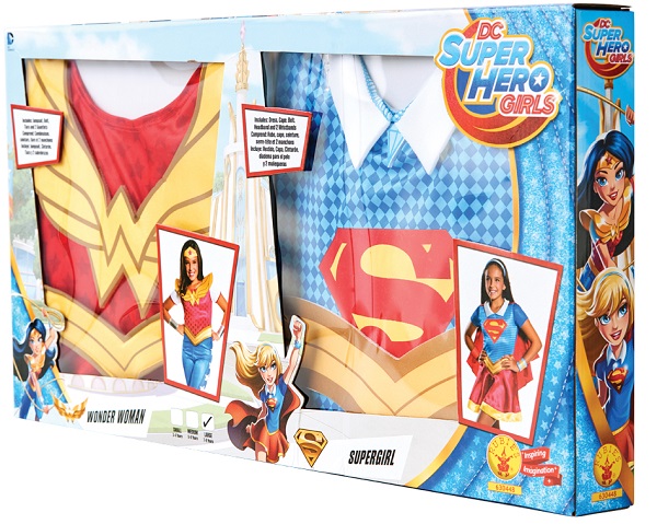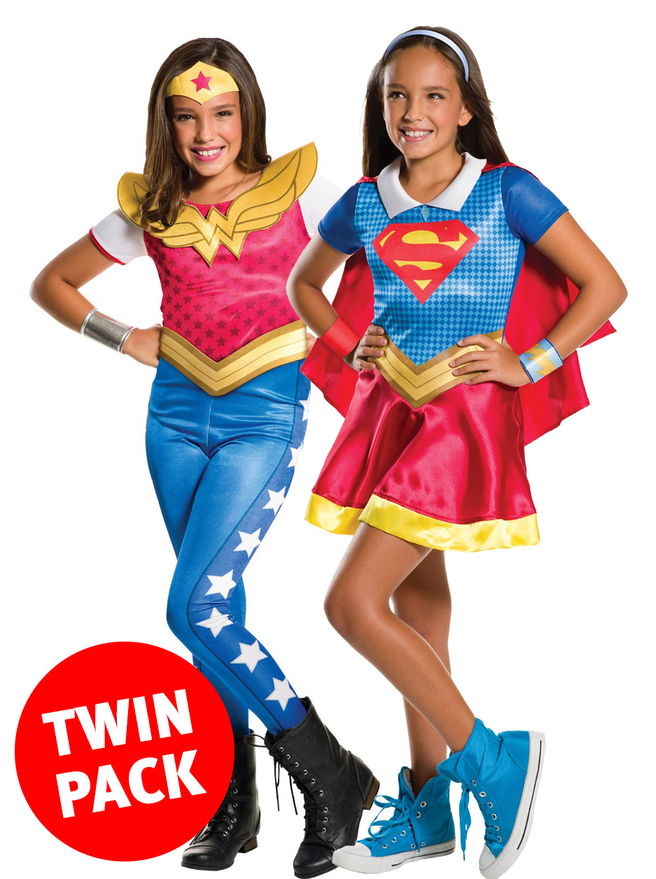 This cool costume includes a Supergirl dress with a belt, headband and two wristbands. It also includes a Wonder Woman jumpsuit with belt, tiara and gauntlets.