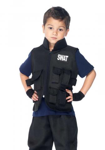 Kids SWAT commander black SWAT vest and a pair of black fingerless gloves.