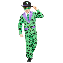 The Riddler Costume includes jacket with attached shirt, trousers and tie as well as a hat and an eye mask.