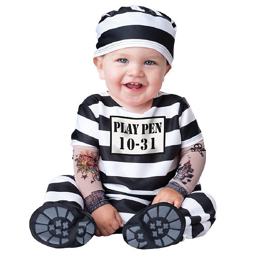 It features an adorable short sleeved jumpsuit with attached mesh tattoo sleeves to cover the length of the arms. The front of the chest displays a printed box that reads “PLAY PEN 10-31,” so your baby can show off his special inmate numbers.