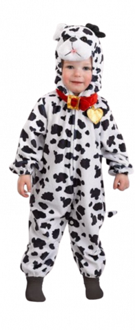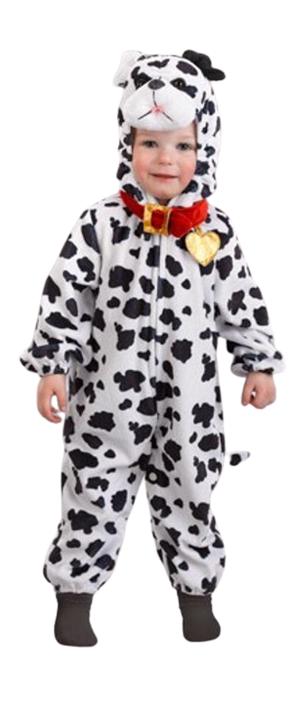 A black and white spotted, plush bodysuit with hood, that zips up at the back and comes complete with a red collar and gold heart dog tag.